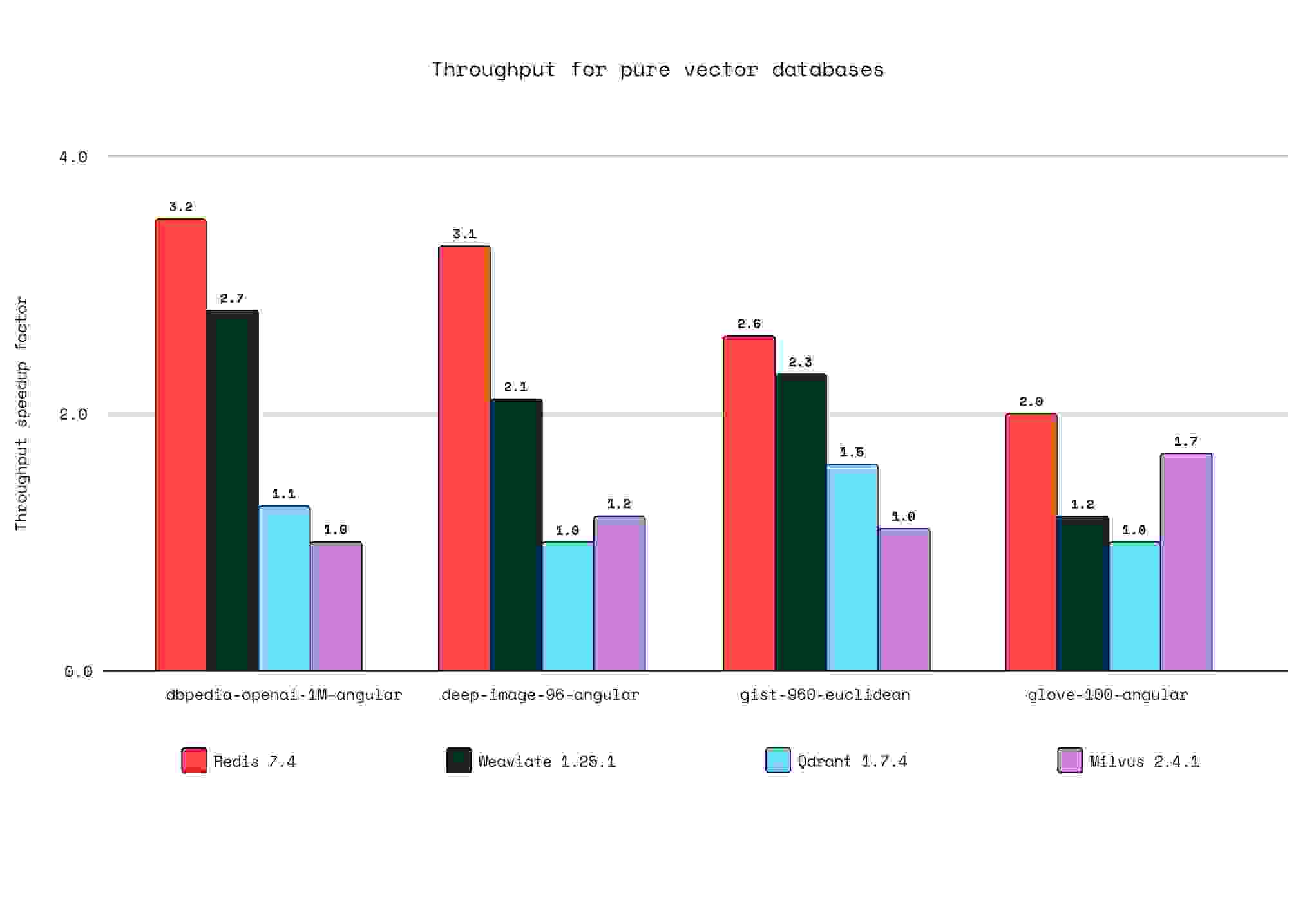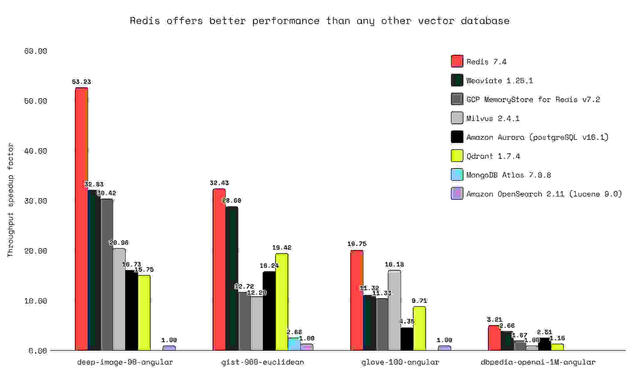 我们测试了其他排名前七的向量数据库,Redis 在各种场景下都超越了它们。我们使用了行业标准基准测试,其中我们使用了相同的硬件并测试了四个模拟不同用例的数据集。 阅读我们的工程博客了解更多关于我们如何进行测试的信息。