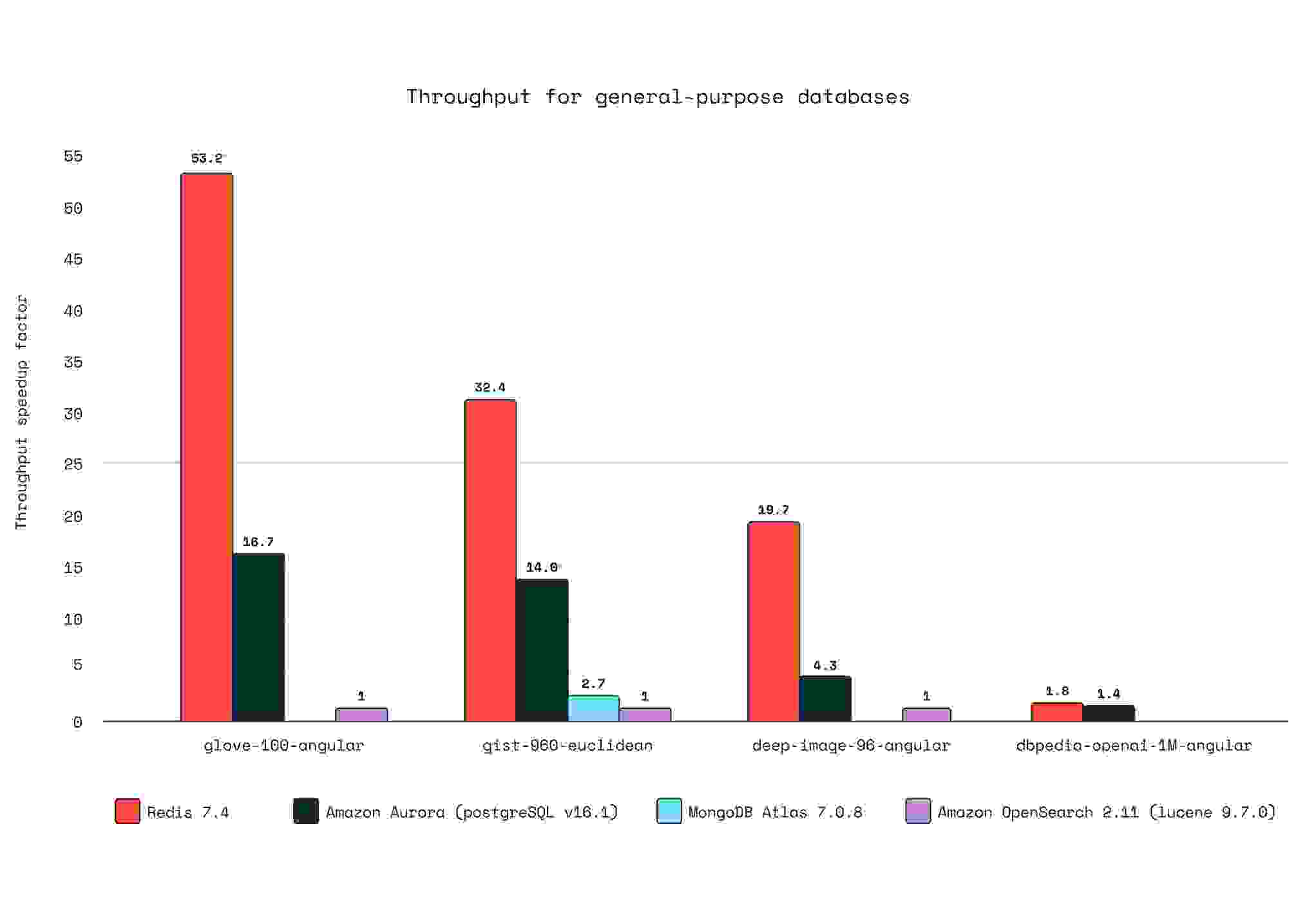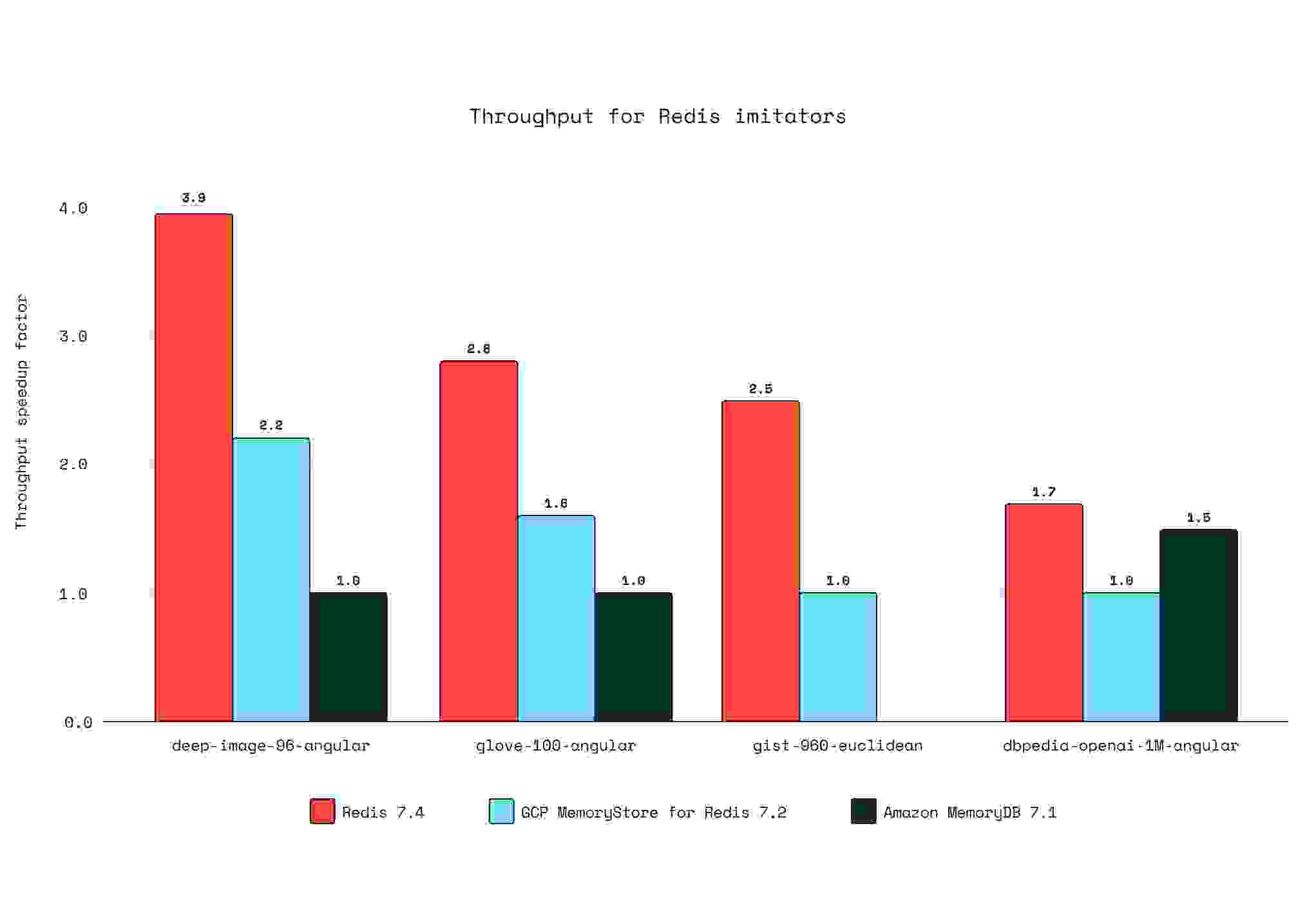 与 Amazon MemoryDB 和 Google Cloud MemoryStore for Redis 等其他 Redis 模仿者相比,Redis 展现出显著更高的吞吐量。对于低维数据集,Redis 的吞吐量是 Amazon MemoryDB 的 3.9 倍,比 Google Cloud MemoryStore for Redis 高 77%。不要选择模仿者。