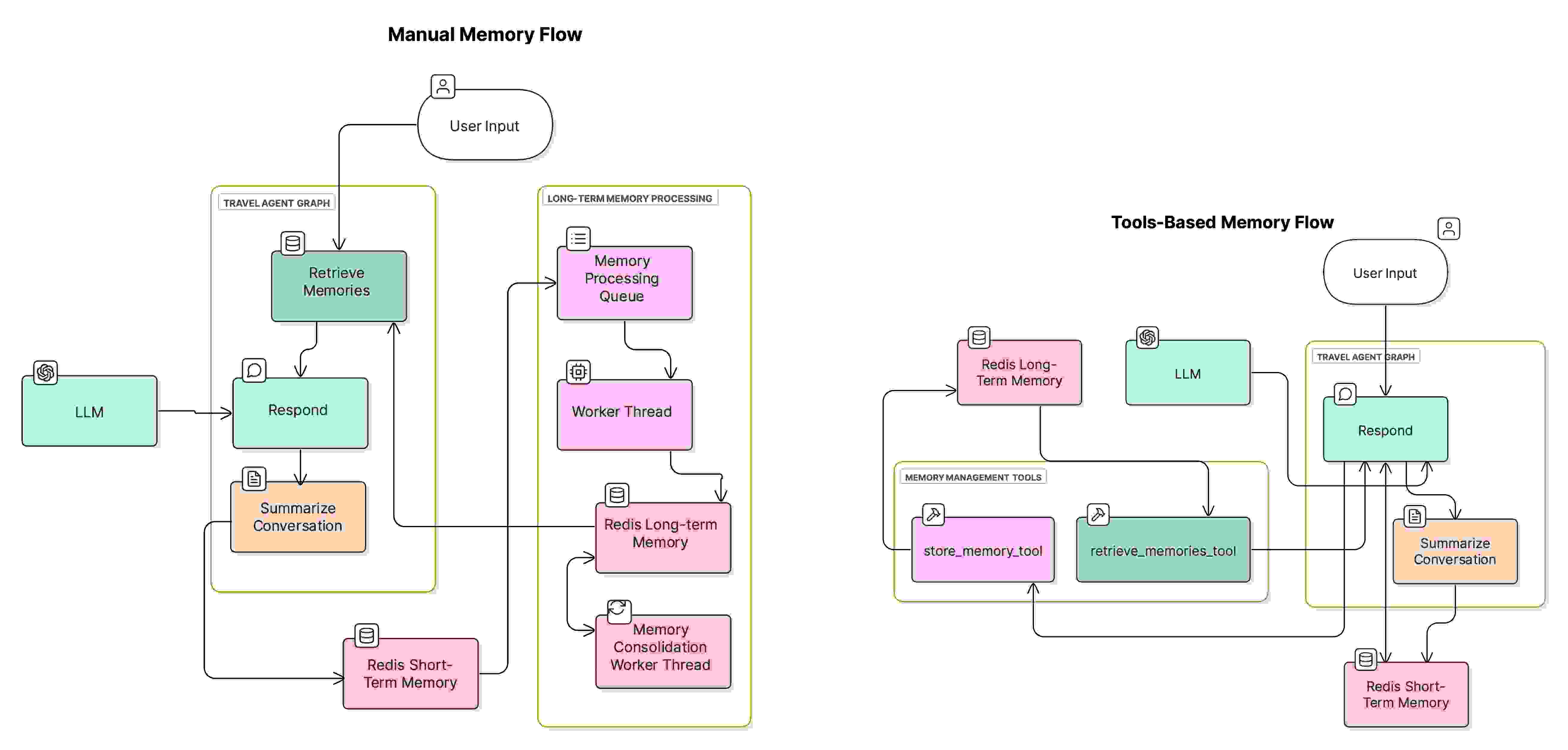 在笔记本中,我们构建了两个版本的旅行代理,一个手动管理长期记忆,另一个则使用 LLM 调用的工具来管理。