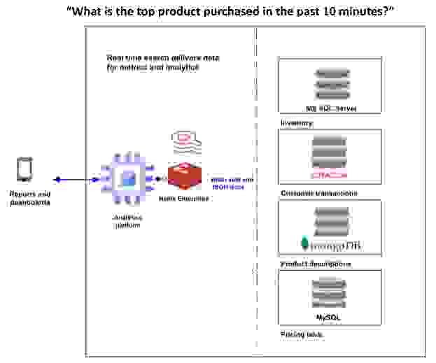 此图描绘了将来自多个记录源的数据整合到一个实时搜索引擎中,从而为分析和新的商业洞察提供及时的数据