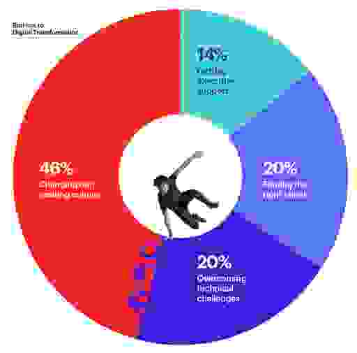 在动员组织进行转型时,文化变革以很大的优势被认为是最大的问题。对于任何在组织中实施技术计划的人来说,这可能并不令人惊讶,但我们对问题的严重程度感到震惊。文化变革比技术和人才障碍加起来还要大。这表明为什么记住这是一个“数字化转型”而不是“技术升级”很重要。您正在改变公司的运营方式,这意味着有时关注变革管理与使用新技术同等重要。