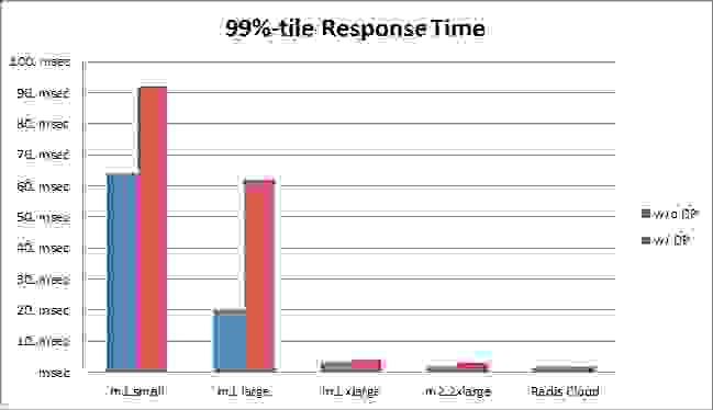 所有平台在不启用数据持久化 (w/o DP) 的情况下运行得更快一些,但差异非常小:使用 m1.xlarge 实例时快了 15%,其他实例快了等于或小于 8%,Redis Cloud 平台快了大约 1%。注意:默认情况下,Redis Cloud 为其每个集群节点使用一个 RAID 配置的 EBS(更多设置详情请参阅本文末尾),但在本次基准测试中,我们对所有其他平台使用了非 RAID 配置。因此,可以安全地假设更优化的 EBS 配置可以减少性能下降。延迟