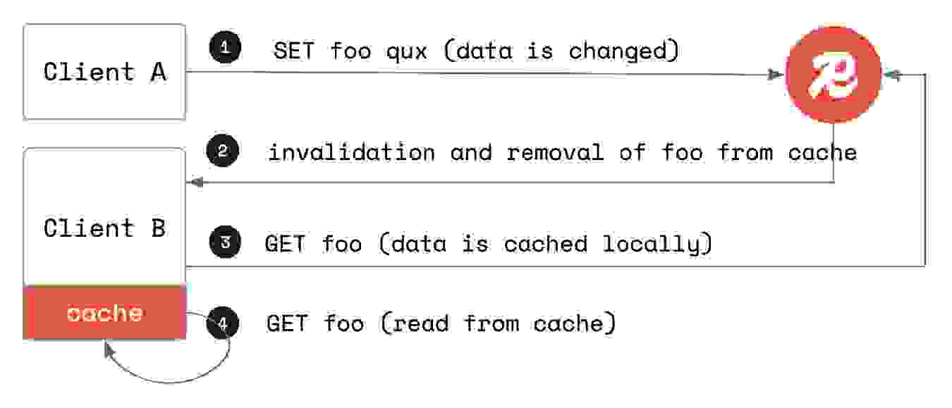 每次缓存键的值在数据库中被修改时,Redis 都会向所有正在缓存该键的客户端推送一条失效消息。这会告诉客户端清除键的本地缓存值,因为该值已失效。这种行为意味着本地缓存命中和失效消息之间存在权衡:本地缓存命中率高于失效消息率的键是进行本地跟踪和缓存的最佳候选。