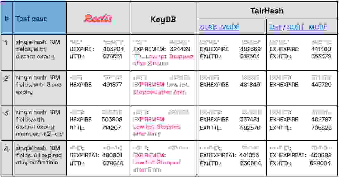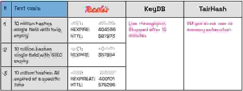 TairHash 表现稍好。它每秒总共释放的字段不超过 1000 个,无论是在单个哈希还是跨多个哈希。并且无论有多少待过期的元素或系统有多繁忙,它都不会超过这个限制。对于 1000 万个项目,假设您有足够的内存,释放全部数据将花费近 3 小时,因此如果应用程序将其用于具有高流量的短 TTL 会话,最终将导致内存耗尽。此限制在一定程度上是可配置的,但不能根据待过期字段的数量或工作负载进行自适应调整。