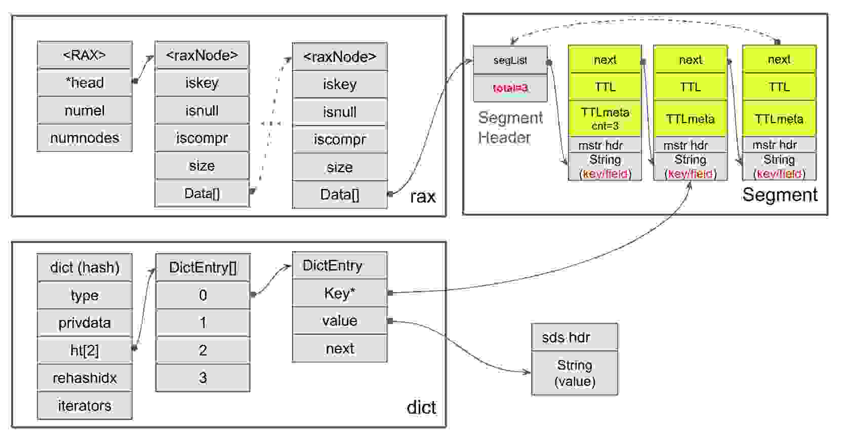 ebuckets 由 RAX 树构成,在规模较小时则为链表。它按项目的 TTL(存活时间)排序。RAX 树中的每个叶子都是一个 bucket,代表一个时间间隔,并包含一个或多个段(segment)。每个 bucket 中的每个段最多包含 16 个项目,形成链表。下图总结了这些想法。它还暗示了 MSTR 的布局以及 dict 类型的哈希表将如何与之集成。过期结构体(用黄色绘制)基本上包含“next”指针、过期时间(简称 TTL)以及一些其他相关元数据