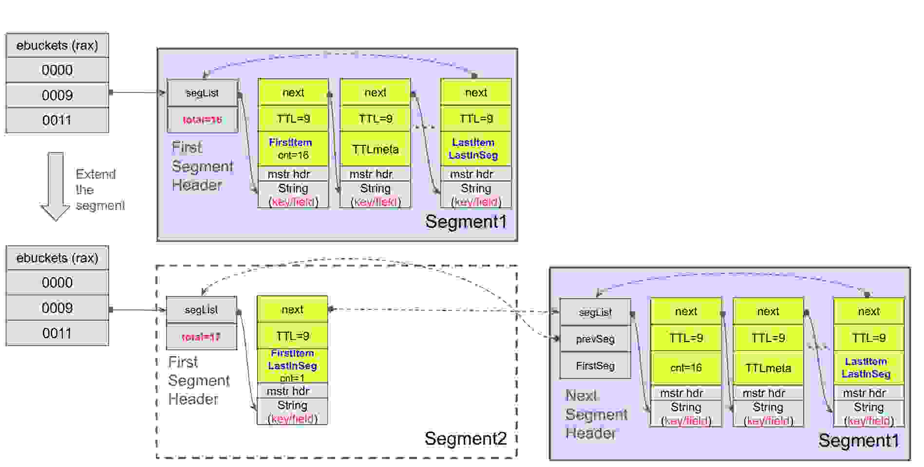 如果一个段达到其限制,它就会分裂,同时也将 bucket 分裂成数据结构中两个较小的时间间隔。如果该段包含具有相同 TTL 的项目,分裂可能不均匀,因为这些具有相同 TTL 的项目必须留在同一个 bucket 中。这引出了另一个关键点:如果一个段满了,并且所有项目都具有相同的 TTL,则 bucket 无法进一步分裂。相反,所有具有相同 TTL 的项目将通过创建一个扩展段并将其链接到原始段来聚合。