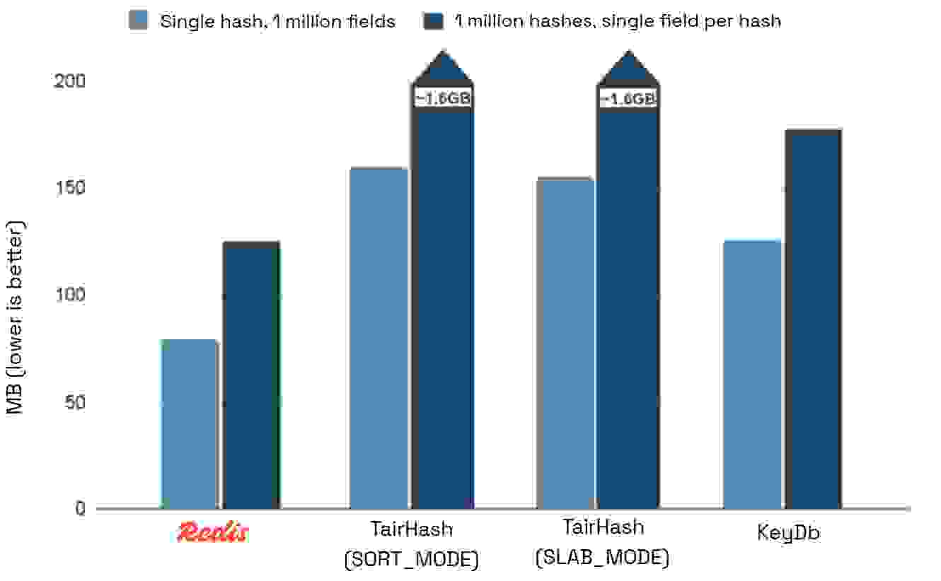 KeyDB 的表现优于 TairHash,但在单个哈希上仍比 Redis 多使用 58% 的内存,在多个哈希上则多使用 41%。
