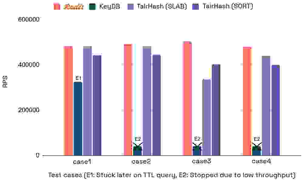我们还想测试 1000 万个哈希,每个哈希只有一个字段的场景,但测试 TairHash 在此场景下具有挑战性。AWS 实例 (m6i.large) 在 SLAB 模式下处理 100 万个哈希后就因内存耗尽而崩溃(每个哈希只有一个字段),在 SORT 模式下则在处理 400 万个哈希时崩溃。另一方面,KeyDB 出现了极低的吞吐量,并且在超过 10 分钟仍未完成时停止了测试。相比之下,Redis 在此场景下也表现出了卓越的性能
