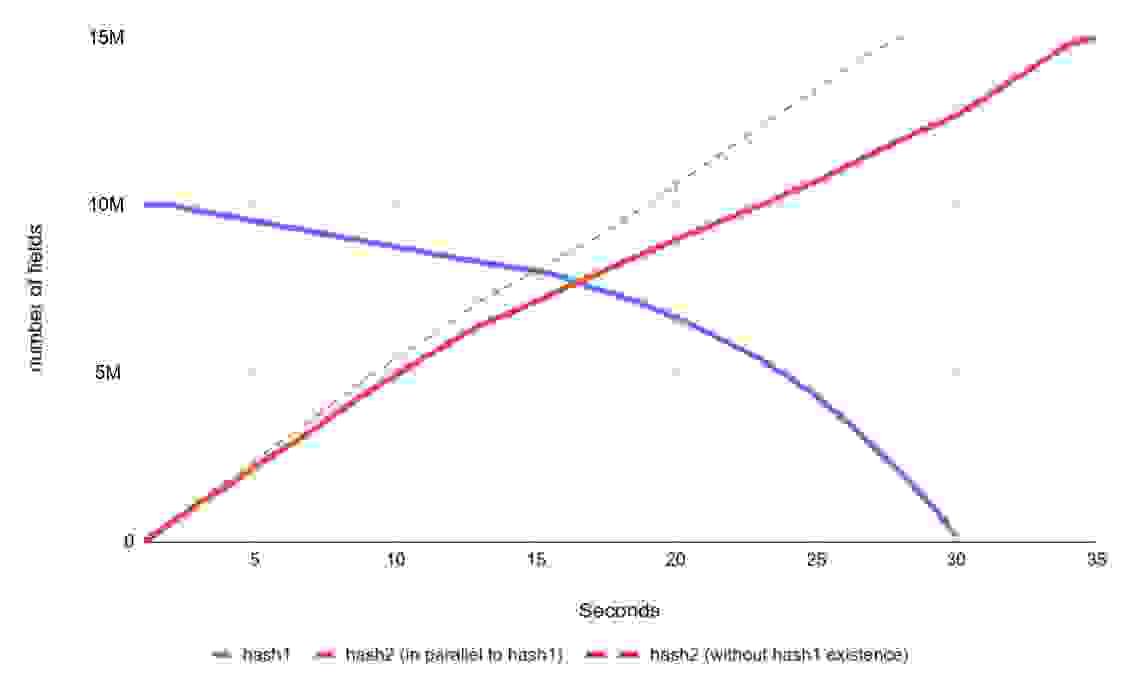 如图所示,用 1500 万个字段填充 hash2 花费了 34.5 秒,而原本为 28 秒,这意味着吞吐量下降了约 18.8%。