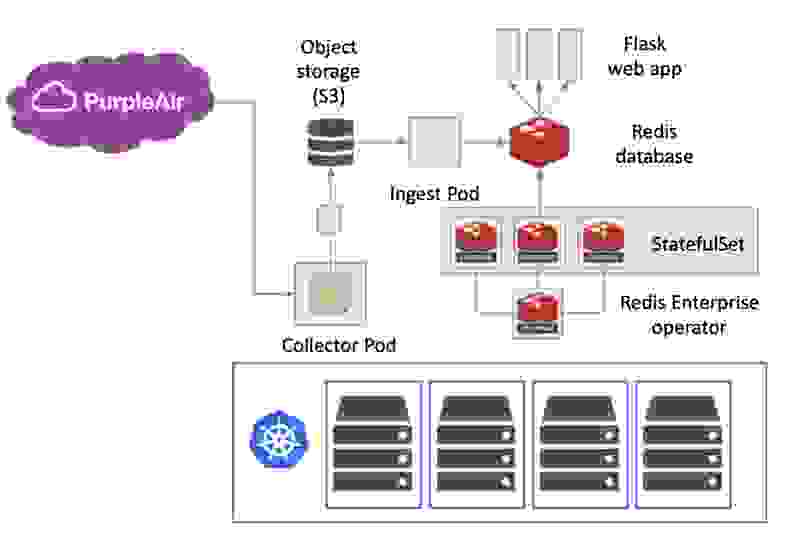 在 2020 年加利福尼亚州的野火期间,我和数百万人一样,一直在查看 PurpleAir 网站以监测空气质量。 除了寻找干净的空气来呼吸,我很好奇 PurpleAir 如何聚合来自其传感器的数据,并且很高兴发现它有一个 API 可以访问其数据。 这似乎是一个展示 Redis 作为使用 Kubernetes 部署的数据库的强大功能的绝佳机会。