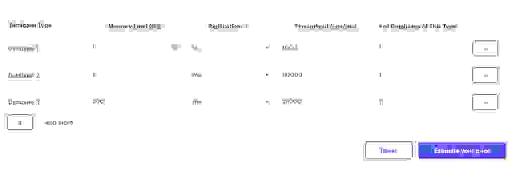 可以使用在线计算器来调整灵活计划工作负载的大小。 只需指定您的数据库内存 限制(如果您的数据库是高可用性的,请确保您的内存限制考虑了副本的大小)、预期的吞吐量 (以 ops/sec 为单位)以及这种类型的数据库数量。 下面的屏幕截图显示了三个数据库部署的示例