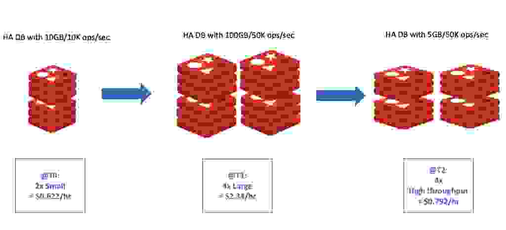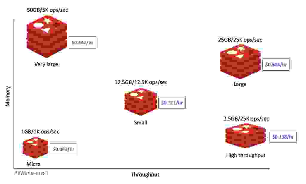 为了提供大多数 Redis 用例的最佳价格,我们定义了五种类型的分片,每种分片都具有不同的内存和吞吐量特性以及每小时不同的价格(注意:分片费率因云提供商和区域而异)。 下图显示了它的工作原理