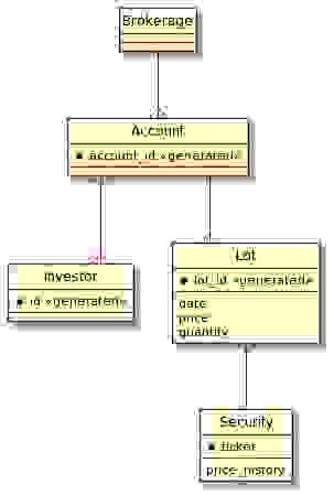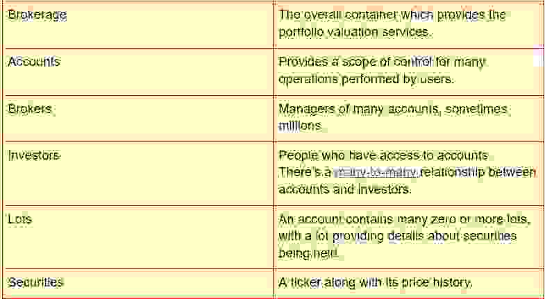 上图缺失了传入价格的集合,尽管它们记录在证券的价格历史中——以及价格变化时瞬时价值和收益的计算。因此,ER 图表示了用于执行投资组合估值的相对静态的数据上下文。