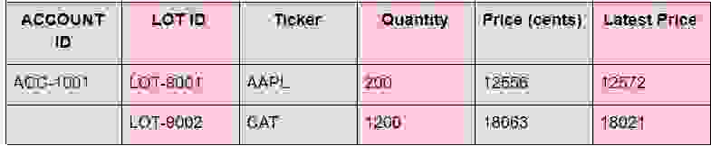 127.0.0.1:6379> HGETALL tickers_by_lot:ACC-1001 1) "LOT-9001" 2) "AAPL" 3) "LOT-9002" 4) "CAT" 127.0.0.1:6379> HGETALL quantities_by_lot:ACC-1001 1) "LOT-9001" 2) "200" 3) "LOT-9002" 4) "1200" 127.0.0.1:6379> HGETALL prices_by_lot:ACC-1001 1) "LOT-9001" 2) "12556" 3) "LOT-9002" 4) "18063"