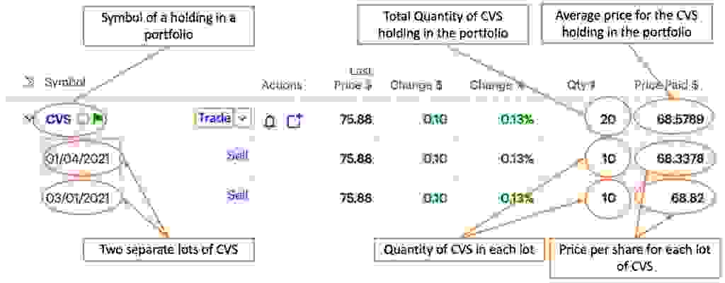 我们先来对投资组合中的一项持有进行建模。在下图中,CVS Health Corp. (NYSE: CVS) 是我们的一个示例持有。CVS 有两个独立的批次——第一个于 2021 年 1 月 4 日购买,第二个于 2021 年 3 月 1 日购买。每个批次的买入交易中购买了相同数量的股票。两次交易都是 10 股,但在不同的每股价格下——第一个批次为 68.3378 美元,第二个批次为 68.82 美元。投资组合中 CVS 持有的总数量为 20 股,平均成本计算如下:((68.3378 * 10) + (68.82 * 10))/20 = 每股 68.5789 美元。