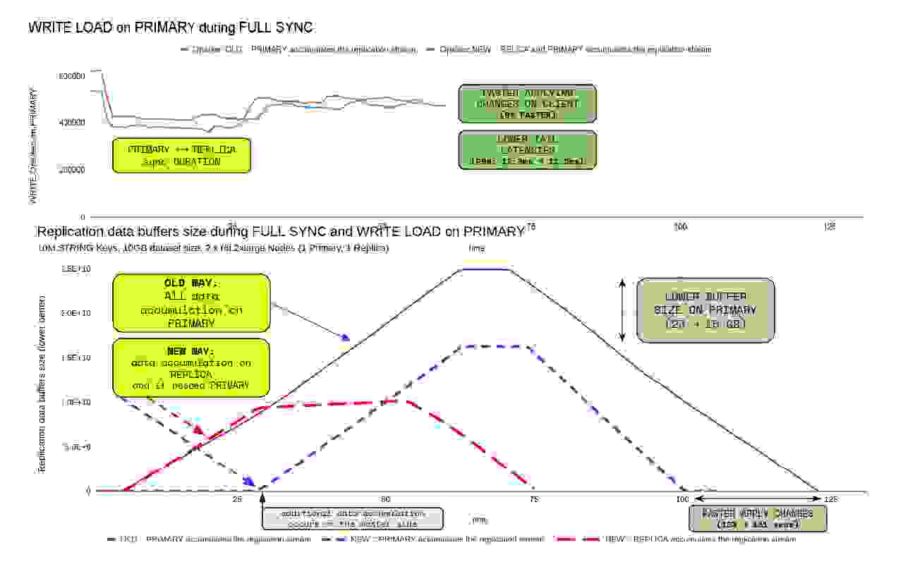 这种新的复制机制提供了三个主要优势。首先,主节点在复制期间能够以更高的速率处理操作。其次,由于内存需求现在由主节点和副本节点分担,主节点用于保存更改的缓冲区大小更小。第三,复制可以更快完成。