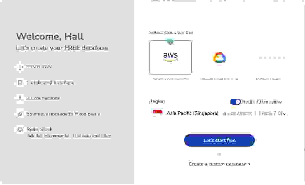 还没有帐户? 别担心! 创建一个 新的免费帐户,您也可以在那里选择 Redis 7.0。