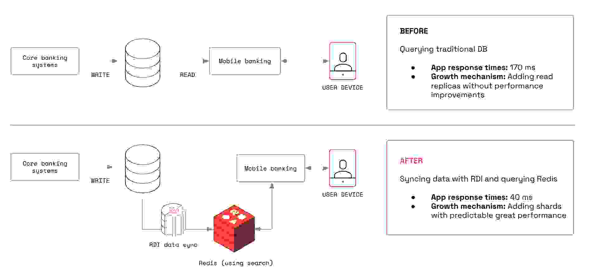 为了解决这个问题,他们决定使用 Redis 作为其移动应用程序的读取源——但他们仍然需要一种更简单的方式来同步其主数据库中的数据。借助 RDI,Axis 能够轻松地将相关记录摄取到 Redis 中,无需复杂的代码或昂贵的 ETL 工具。他们可以即时捕获和处理来自九个大型主数据库表的实时数据变更。这意味着与直接从核心银行表检索数据相比,他们可以提供惊人的 4.25 倍更快响应时间——这是系统性能和整体效率的巨大提升。