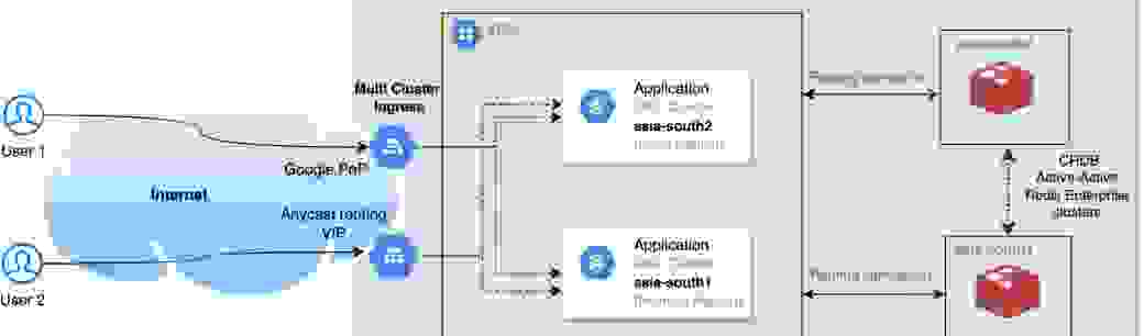 我们在每个区域都有单独的 GKE 集群。每个区域中的应用程序连接到各自的 Redis Enterprise 集群。此架构利用 GKE 的多集群 Ingress 控制器。这是一项 Google 托管的服务,支持跨集群和跨区域部署共享负载平衡资源。