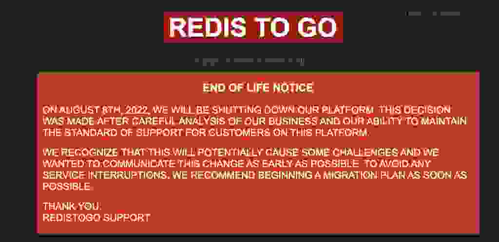 这已经不是我们第一次看到托管 Redis 开源的第三方托管提供商突然更改或停止其服务。例如,同样提供托管 Redis 的 RedisToGo 最近宣布关闭。