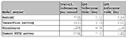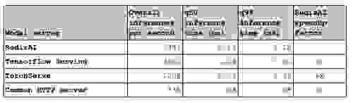 考虑到每种不同模型服务解决方案的最佳结果,请注意,当其他模型服务器在大约每秒 5 万次推理时负载过重,而 RedisAI 在高达每秒 19 万次推理时仍保持稳定且稳定的亚毫秒级延迟,并且无需向集群添加额外的虚拟机,如下表所示