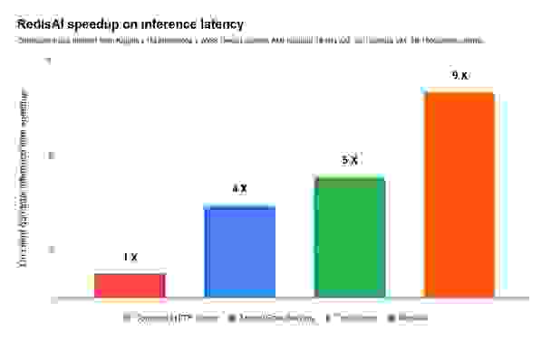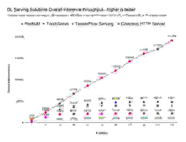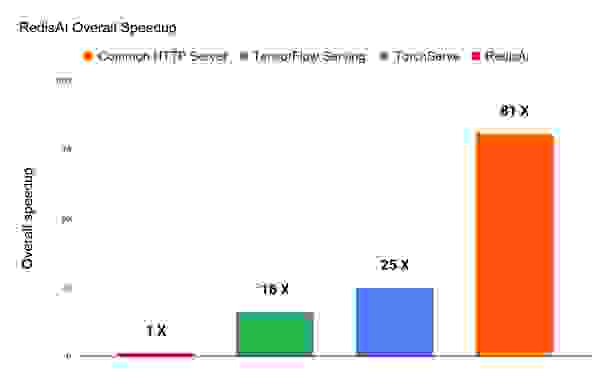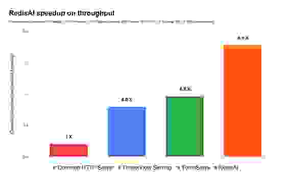 在相同的硬件和基于相同模型进行服务的情况下,RedisAI 处理的推理次数是 TensorFlow Serving 的 4.8 倍,是 TorchServe 的 4 倍,是常见 Web API 的 9 倍,如下所示: