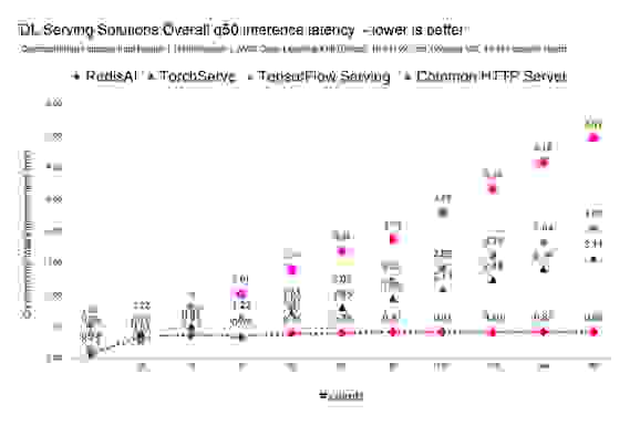 最后,如前图所示,对于高负载/高并发用例,RedisAI 无可匹敌,因为在并发增加时,只有 Redis 是唯一能保持亚毫秒级延迟以及稳定和状态结果的模型服务器。