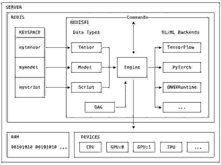 由于张量存储在 Redis 服务器的内存空间中,因此 DL/ML 后端库和脚本可以轻松访问它们,且延迟极低。这种数据局部性使得 RedisAI 在服务模型时能够提供最佳性能。这也使其成为在生产环境中部署 DL/ML 模型并允许任何应用使用它们的完美选择。