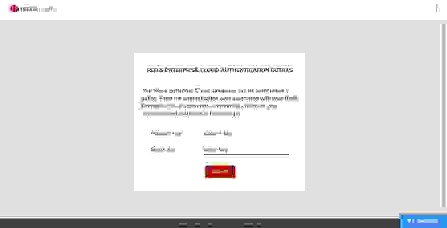 在 Redis Cloud Enterprise(仅限 Pro 订阅)中,配置甚至更容易,因为您只需提供您的帐户密钥和密钥即可连接您的 Redis Enterprise Cloud 帐户并获取所有数据库的列表,如下所示