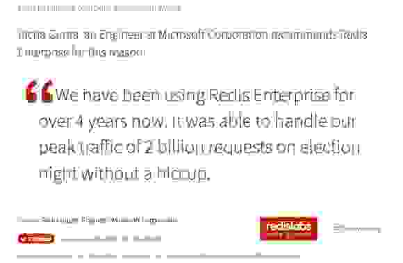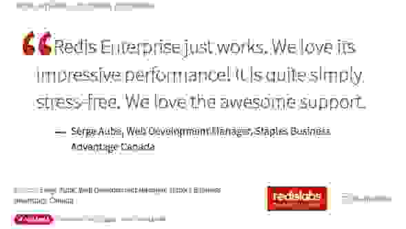 例如,来自 Staples 的 Serge Aube 分享了他对 Redis Enterprise 令人印象深刻的性能和可用性的喜爱