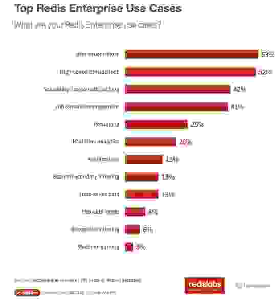 与 去年的结果 相比,我们注意到组织使用 Redis Enterprise 进行高速事务和消息传递的方式显着增加。 并且我们还在实时分析、通知、时间序列数据和地理空间索引方面看到了持续的使用。 我们认为,尽管市场一片哗然,但机器学习 (ML) 在 Redis 采用率方面略有下降,因为实际上在许多组织中有条不紊地应用 ML 还有很长的路要走。