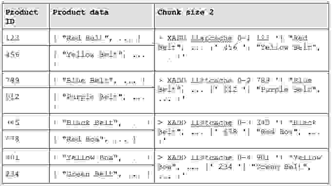 要将这种类型的数据建模为 Stream,你需要确定一个特定的“块”大小,并将其作为一个条目。为什么是块而不是整个结果页作为条目?这允许你在分页中有不同大小的页面(例如,每页 10 个项目可以由 2 个大小为 5 的块组成,而每页 25 个则由 5 个大小为 5 的块组成)。每个条目将包含映射到产品 ID 的字段,值则是产品数据。看这个简化示例,块大小人为设置得很小