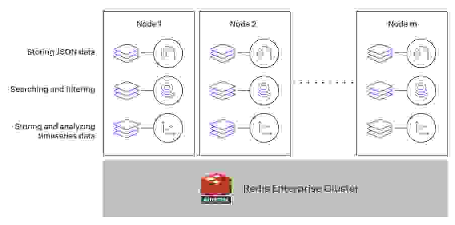 大多数开发人员选择使用 Redis Enterprise,因为它提供软件多租户支持。单个 Redis Enterprise 软件部署(通常部署为节点集群)为数百个租户提供服务。每个租户都有自己的 Redis 数据库端点,该端点与其他 Redis 数据库完全隔离。如左图所示,有多个数据库,例如用于存储 JSON 数据的 DB1,用于搜索和过滤的 DB2,以及用于存储和分析时间序列的 DB3 等。