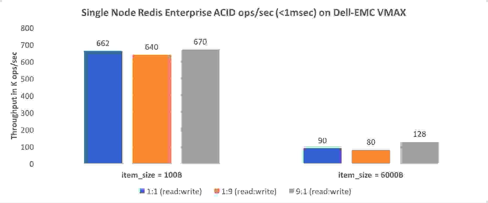 我们惊讶(并高兴)地发现,使用 Dell-EMC VMAX 等高端持久化存储设备,单个 Redise 集群节点可以在保持亚毫秒级数据库延迟的同时,支持超过 650K ACID ops/秒。