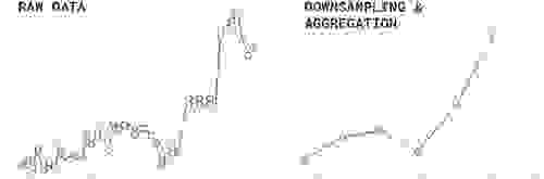左侧是原始数据样本。高点基数模糊了整体趋势并需要更多存储空间。右侧是相同数据的下采样表示。Time Series 可以通过聚合一段时间内的许多点来自动执行下采样,从而减少历史数据中的噪声和存储需求。
